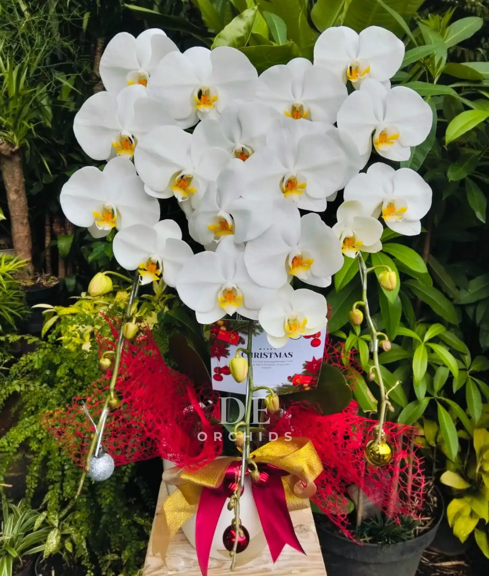 Hadirkan kemewahan dan nuansa Natal yang hangat ke dalam ruangan Anda dengan Anggrek Bulan Edisi Natal dari DE Orchids. Rangkaian eksklusif ini memadukan kecantikan anggrek bulan putih yang mewah dengan sentuhan dekorasi Natal yang elegan, menciptakan hadiah istimewa untuk momen spesial di akhir tahun.