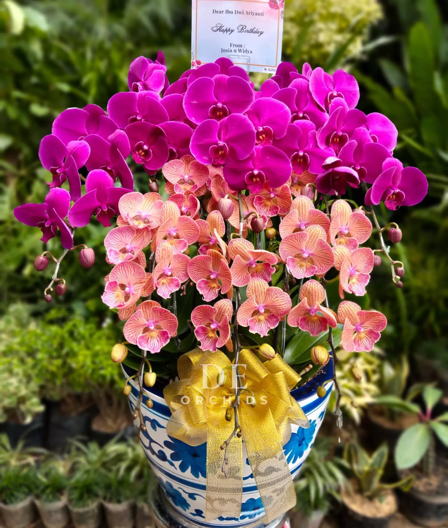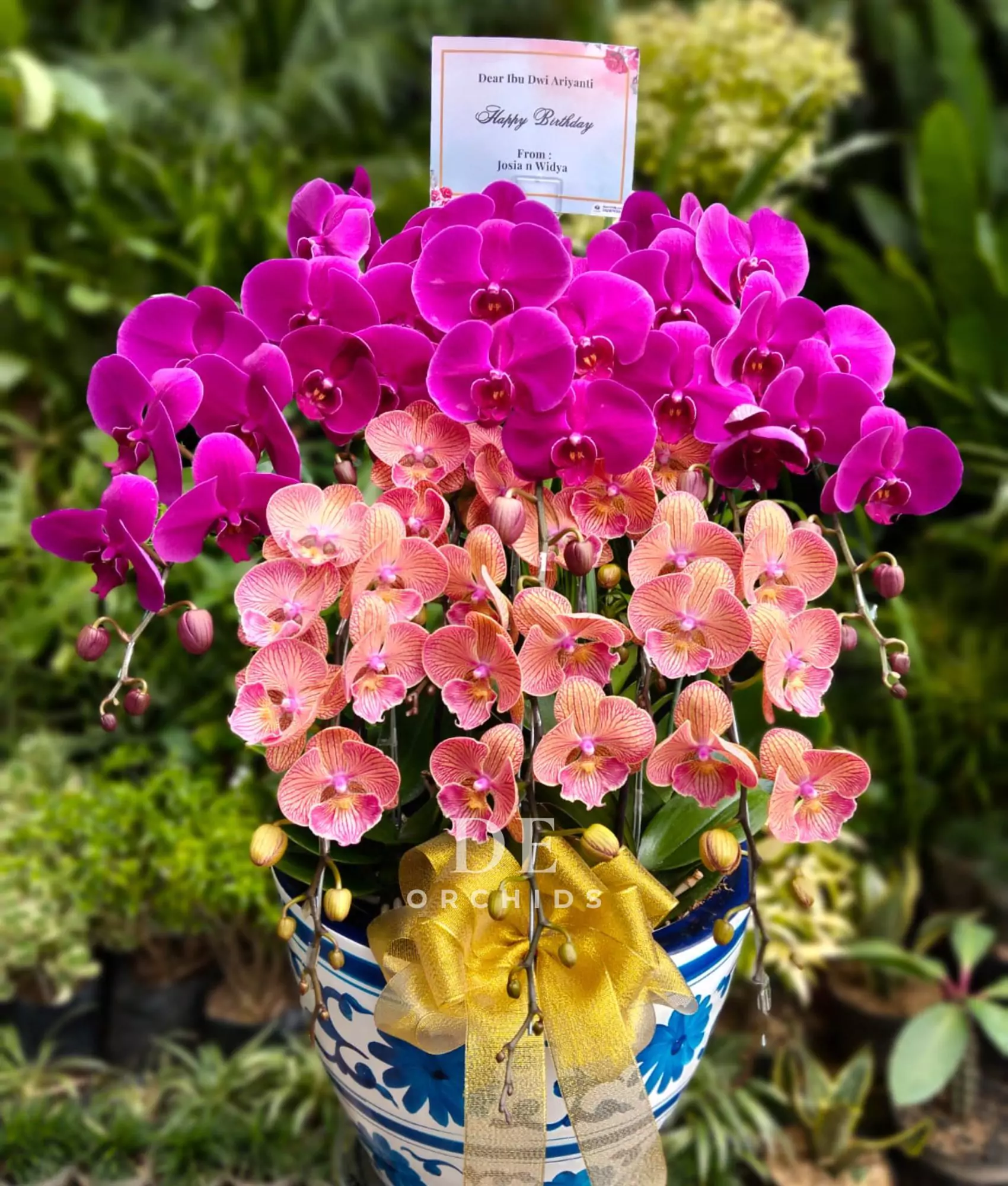 Anggrek Bulan Ungu Mix Orange menghadirkan kombinasi elegan antara keanggunan ungu yang memikat dan pesona lembut orange berurat indah. Disusun rapi dalam pot keramik bermotif klasik dengan sentuhan pita emas, rangkaian ini sempurna sebagai hadiah istimewa yang melambangkan kemewahan, kehangatan, dan doa terbaik untuk orang tersayang. Cocok untuk ulang tahun, ucapan selamat, maupun hiasan ruangan yang penuh arti.