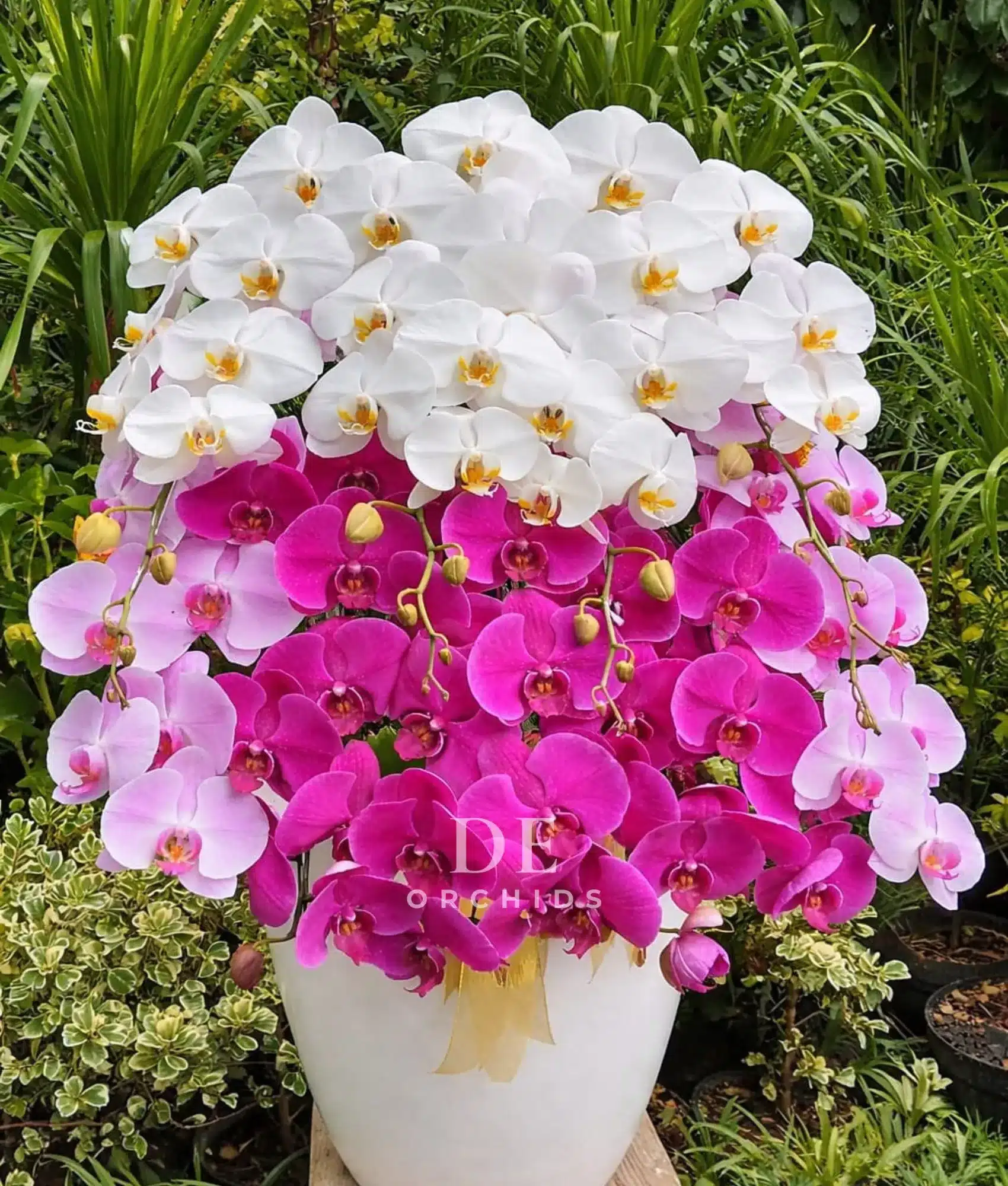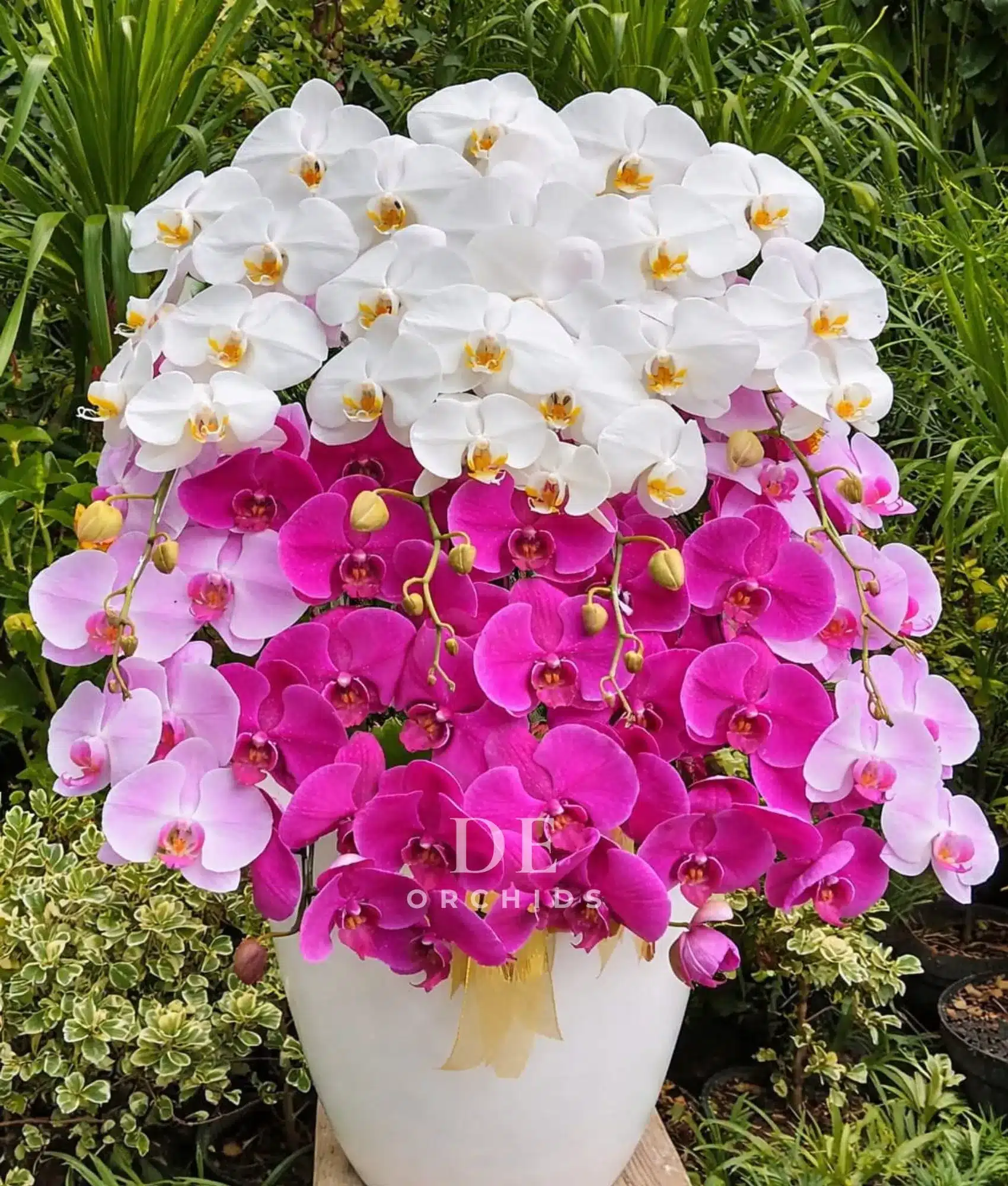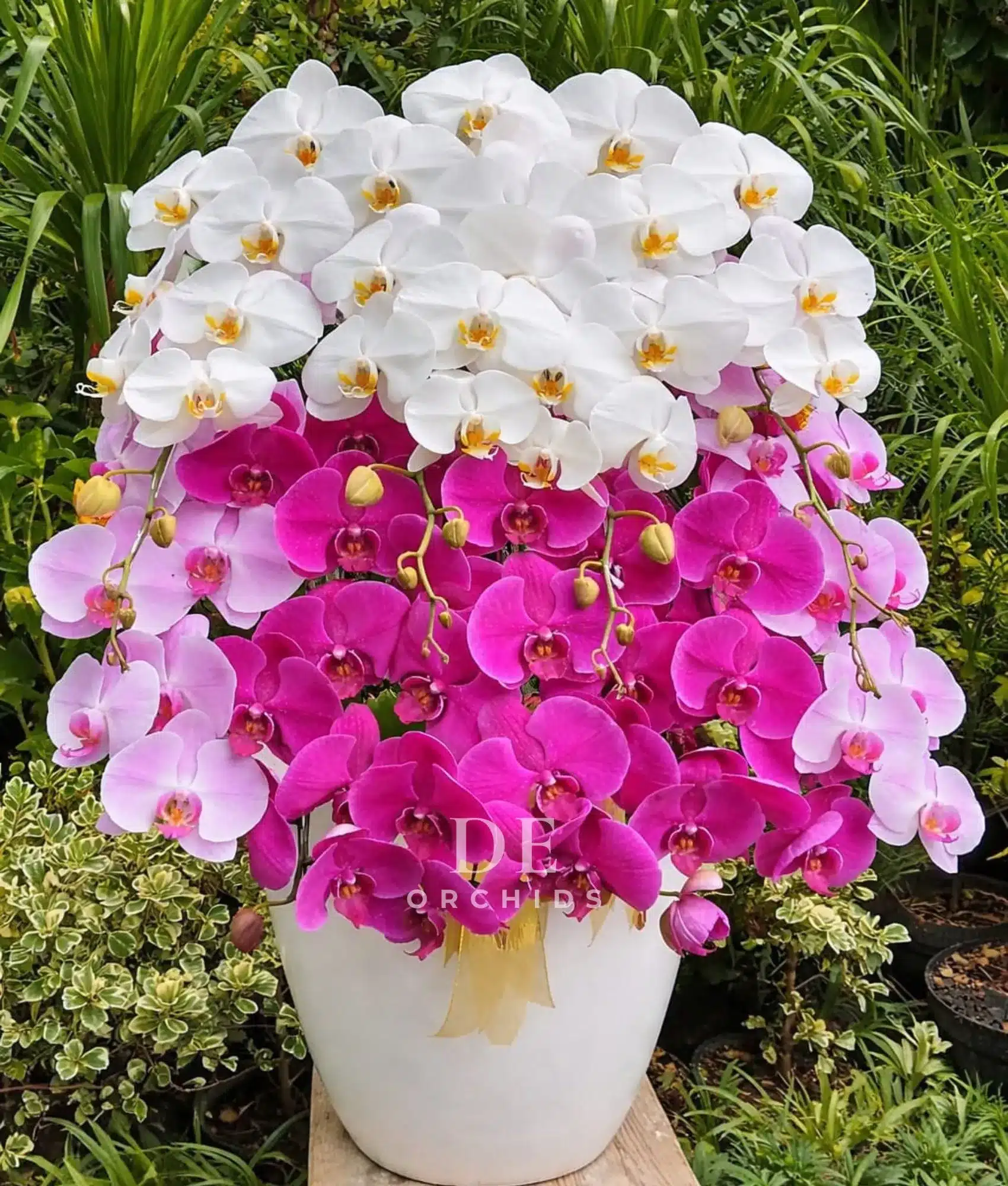Anggrek bulan ini disusun rapi dengan bunga yang besar, segar, dan tahan lama. Warna putih melambangkan kesucian dan elegansi, sementara ungu dan pink memberikan sentuhan manis serta kesan eksklusif. Cocok untuk berbagai momen spesial seperti ulang tahun, pernikahan, pembukaan usaha, hari raya, hingga dekorasi rumah dan kantor.