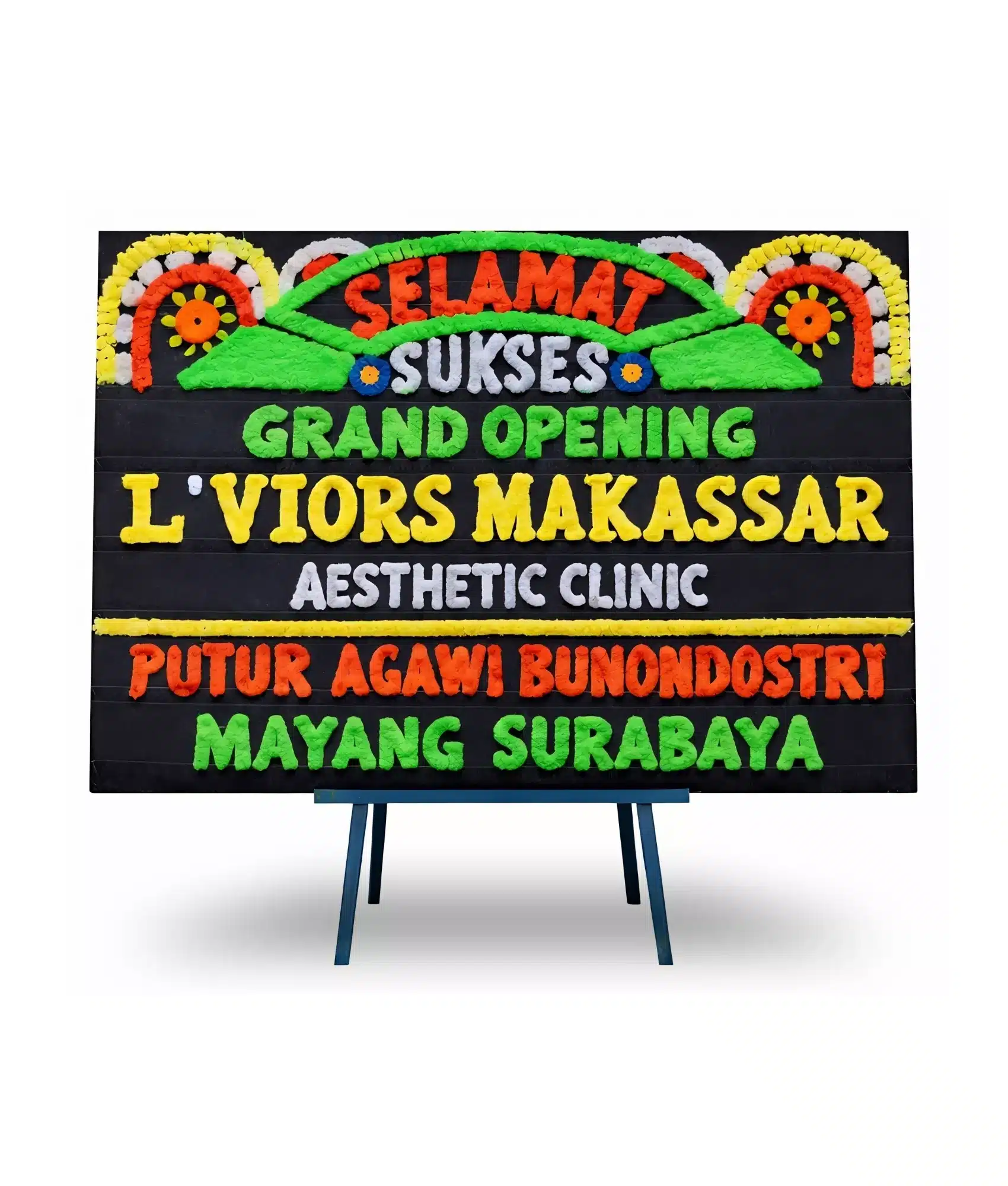 Rayakan momen pembukaan usaha dengan lebih berkesan menggunakan karangan bunga grand opening Makassar. Dirancang dengan kombinasi warna cerah, tulisan tegas, dan tampilan yang mencolok, bunga papan ini sangat cocok untuk menarik perhatian dan memberikan kesan profesional pada acara grand opening.