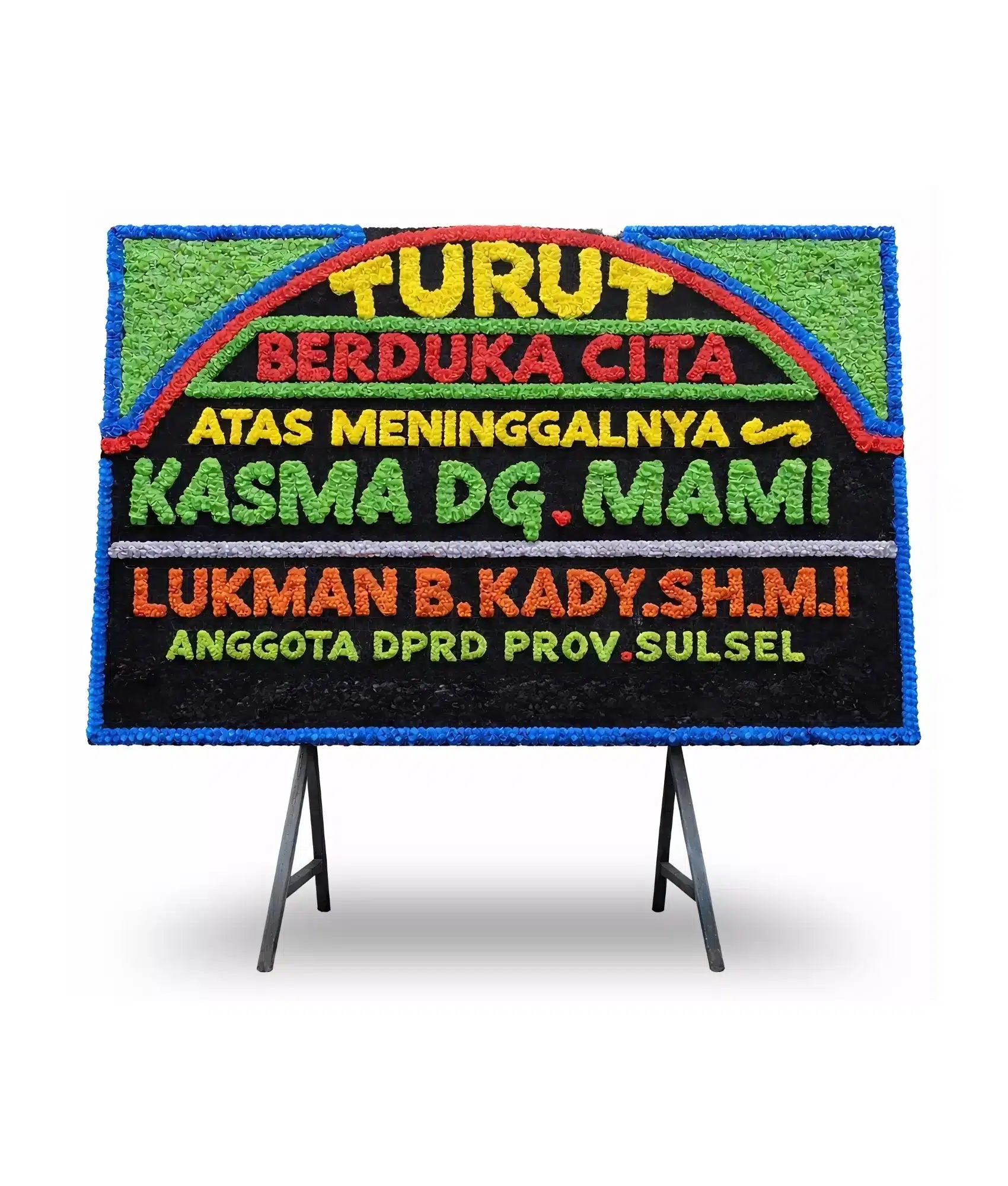 Dengan komposisi warna yang cenderung lembut dan desain yang rapi, karangan bunga ini menghadirkan kesan sopan, tenang, dan penuh empati. Tulisan ucapan dibuat jelas dan mudah dibaca sehingga pesan belasungkawa tersampaikan dengan baik.