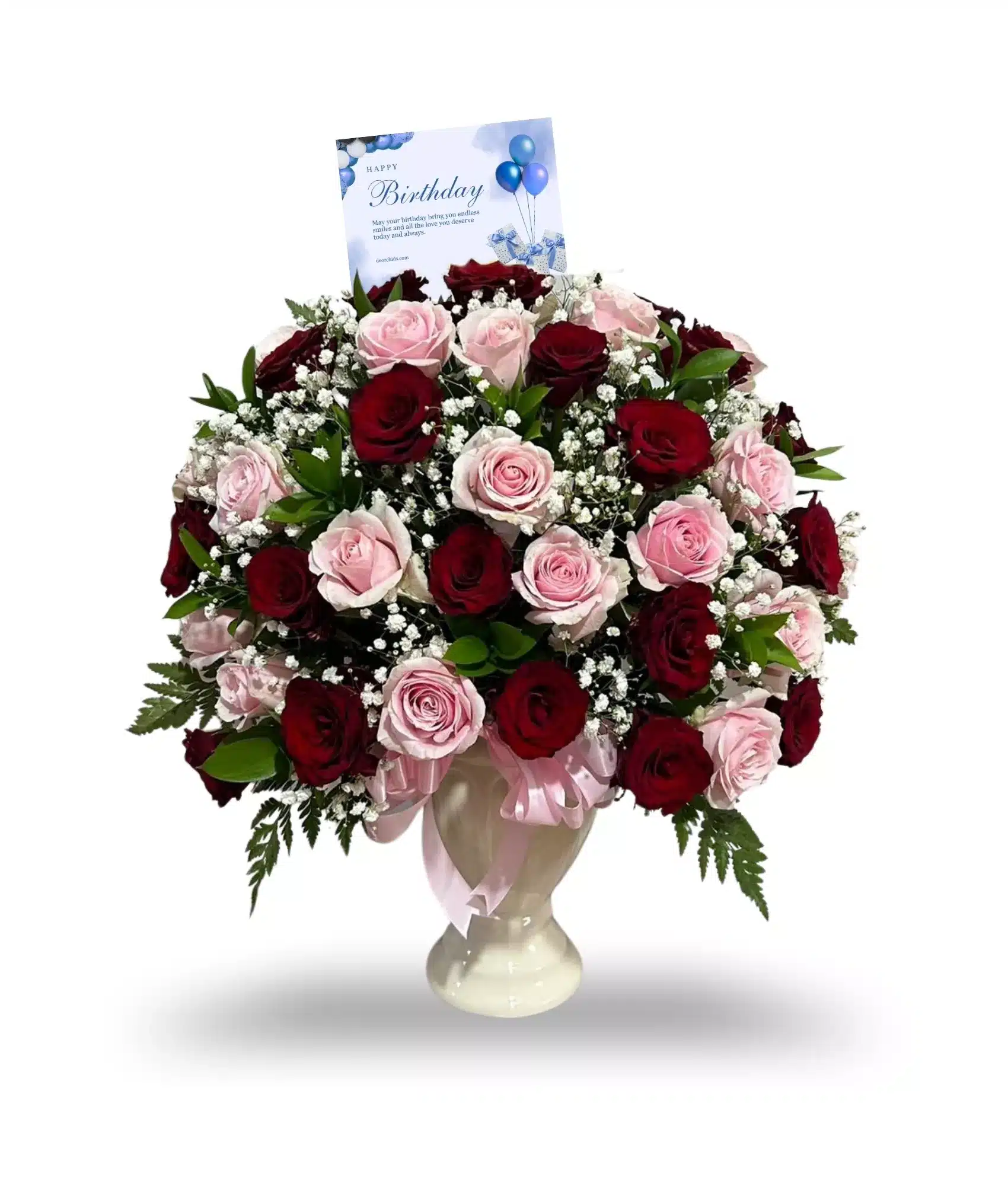 Rayakan setiap momen istimewa dengan Romantic Blush Celebration, rangkaian bunga meja yang memadukan keindahan mawar merah dan pink dalam tampilan yang elegan dan penuh cinta. Perpaduan warna merah yang melambangkan kasih sayang dan pink yang menghadirkan kelembutan menjadikan bunga ini pilihan sempurna untuk berbagai momen bahagia.