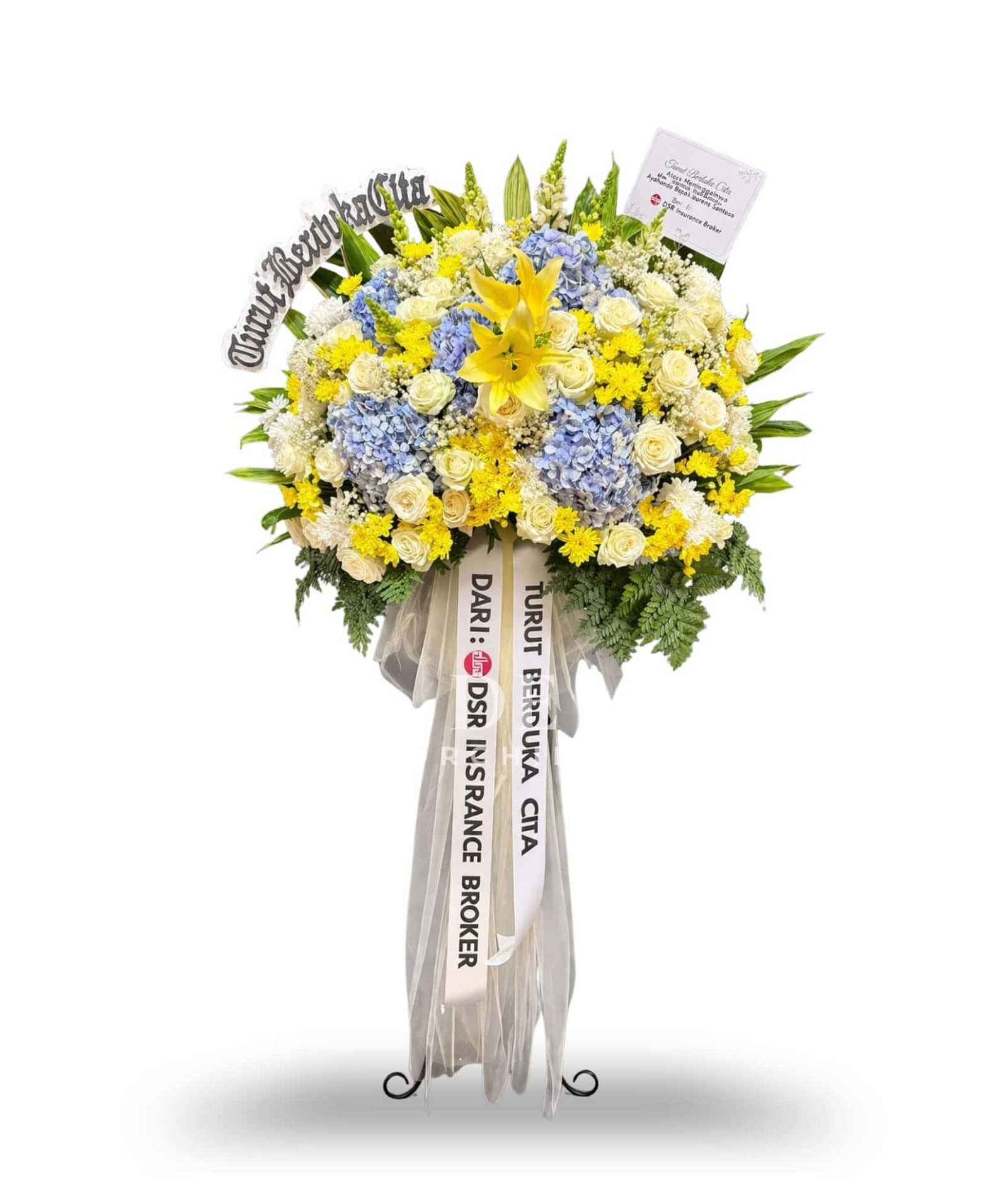 Standing flower duka cita ini hadir dengan perpaduan warna kuning dan biru yang elegan, melambangkan harapan, ketenangan, dan penghormatan terakhir kepada almarhum/almarhumah. Rangkaian bunga disusun dengan komposisi yang seimbang dan penuh, memberikan kesan hangat sekaligus menenangkan bagi keluarga yang ditinggalkan.